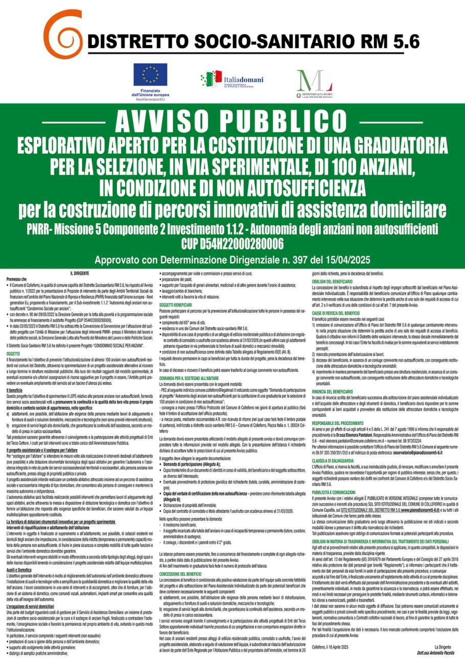 AVVISO PUBBLICO ESPLORATIVO APERTO PER LA COSTITUZIONE DI UNA GRADUATORIA PER LA SELEZIONE, IN VIA SPERIMENTALE, DI 100 ANZIANI, IN CONDIZIONE DI NON AUTOSUFFICIENZA per la costruzione di percorsi innovativi di assistenza domiciliare - CONDOMINIO SOCIALE